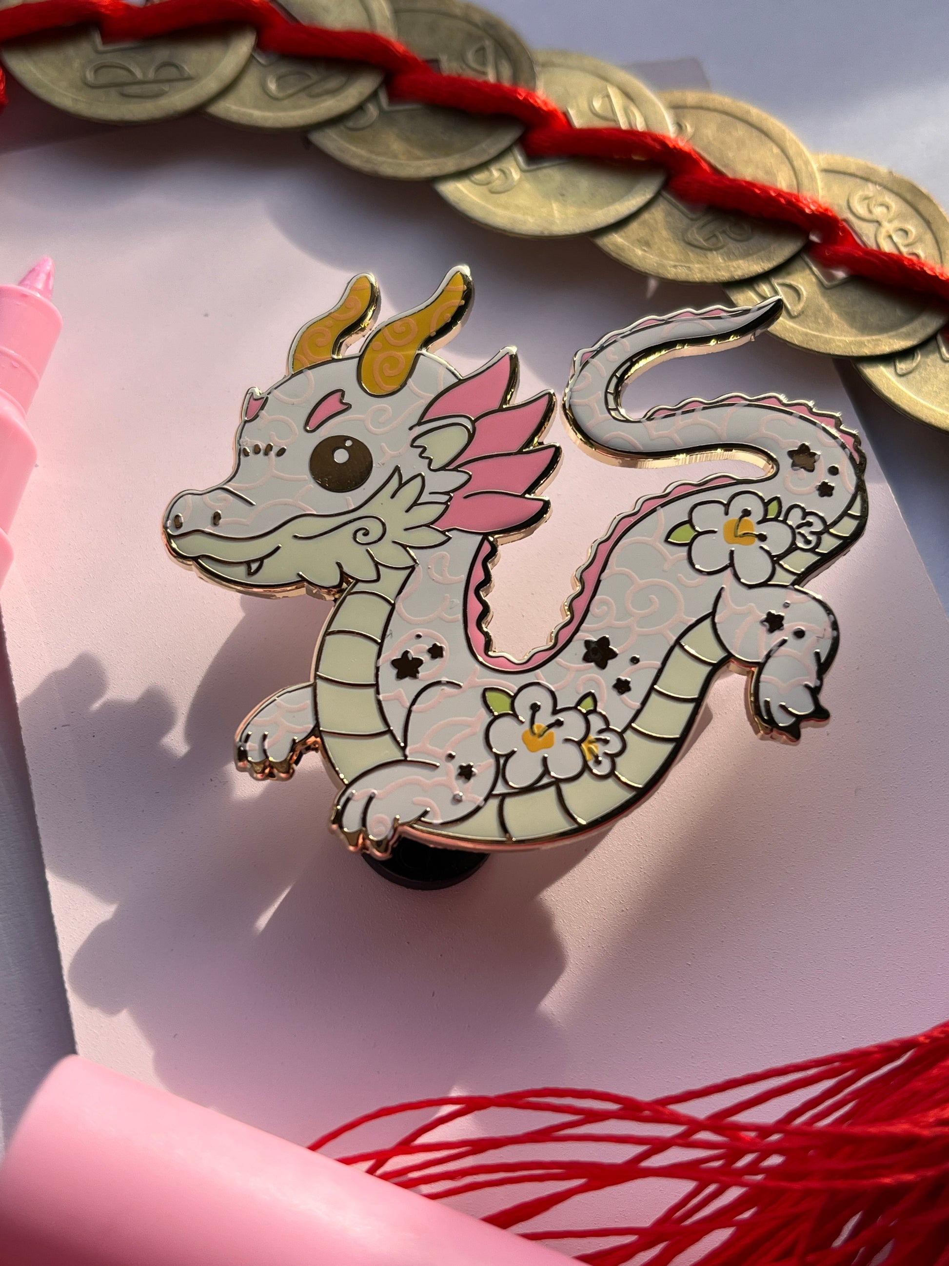 Introducing our exclusive 1.75" White Chinese Dragon Hard Enamel Pin, designed to commemorate the Chinese New Year. This pin features intricate screenprint detailing on the body and horns, perfect for any dragon lover.